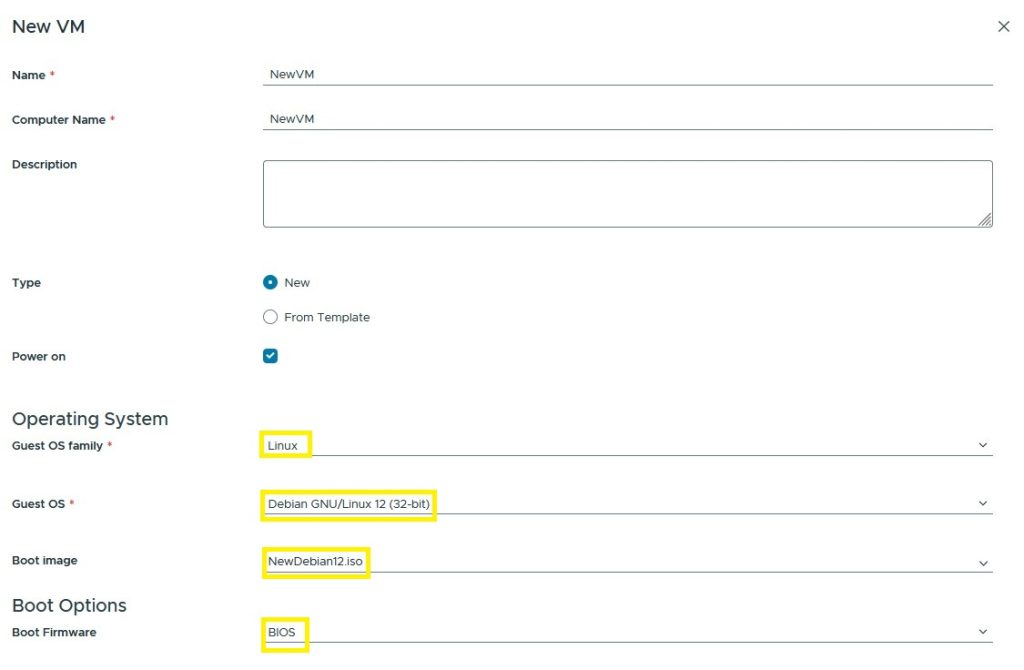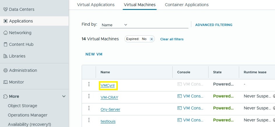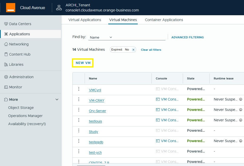 On the VCD portal, log in to your organization and access your OrgvDC. Then, navigate to your datacenter and select Virtual Machine. Click New VM.