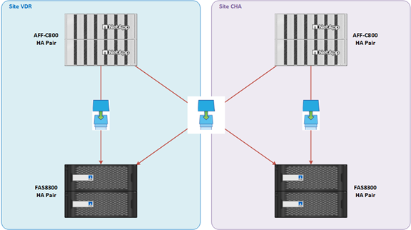 Replication between the customer’s 2 SVMs takes place via the inter-site link between VDR and CHA.