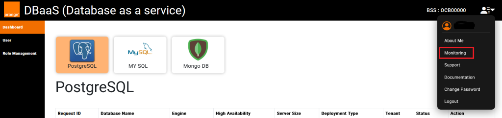 DBaaS Portal provides database usage and performance monitoring capability based on Grafana via a separate portal link of which is provided under User drop down, marked in red box “Monitoring”. User account for this portal is created and shared as part of DBaaS subscription process.