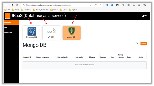 User can initiate database provisioning by clicking on a database tile and selecting the Create button from the Dashboard. This triggers the provisioning form for the selected database type. For details about DB provisioning and management refer to DB user manual – https://cloud.orange-business.com/en/?post_type=epkb_post_type_1&p=12243616