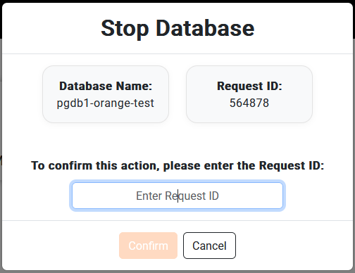 Each action would require a confirmation and user need to input the request id, example to start a stopped DB you need to copy the mentioned id in the text box and click confirm.