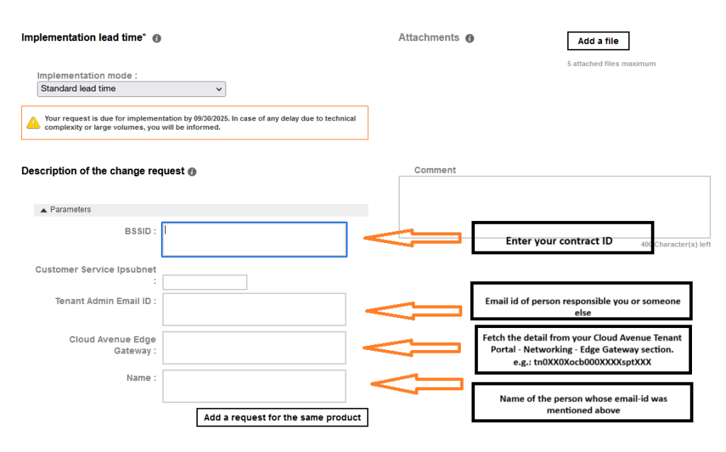 - Fill in the details for the different fields mentioned under the “Description of the change request”. Once done click on “confirm the request”. Refer below screenshot for the value that needs to be filled mandatorily.
