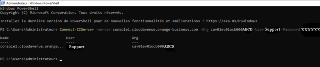 Connect-CIServer <API vCD> -Org <organisation> -User <login> -Password <pwd>