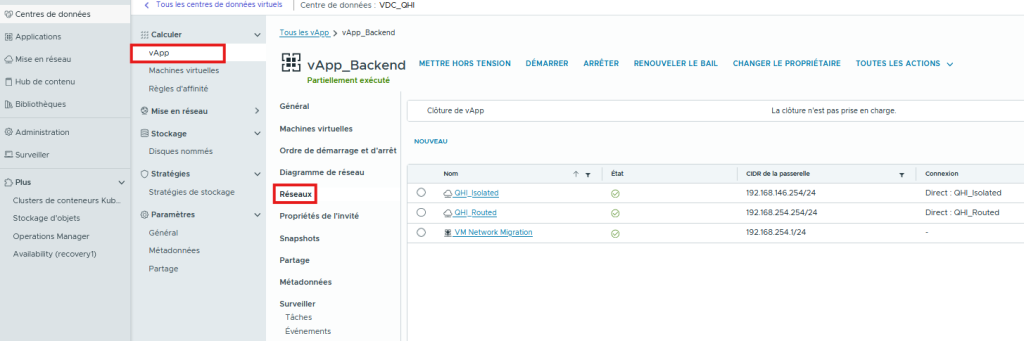 Résultat : suite à l’ajout du réseau dans la vAPP, les VM des vAPP voient tous les réseaux disponibles dans la vAPP.