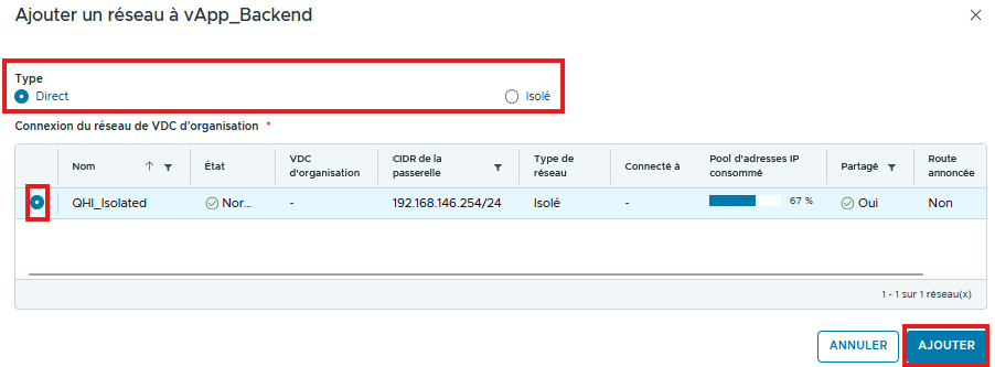 Résultat: votre réseau « QHI_Isolated » est maintenant disponible pour les VM de votre vAPP.