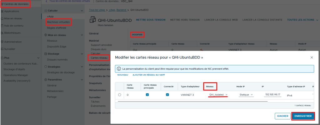 Votre VM doit faire partie d’une vAPP où votre réseau isolé est disponible