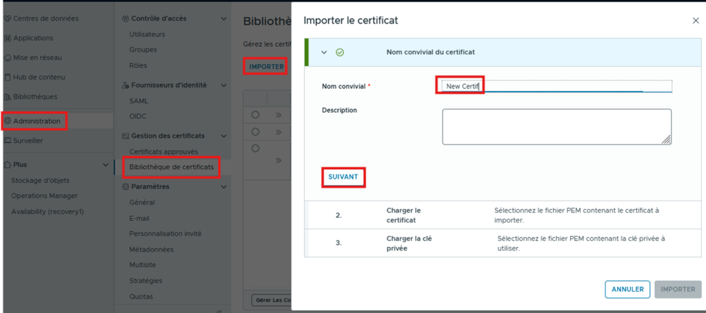 Depuis la vue « Administration« / »Bibliothèque de certificats« , sélectionnez IMPORTER. Donner un Nom à votre Certificat et faire « SUIVANT«