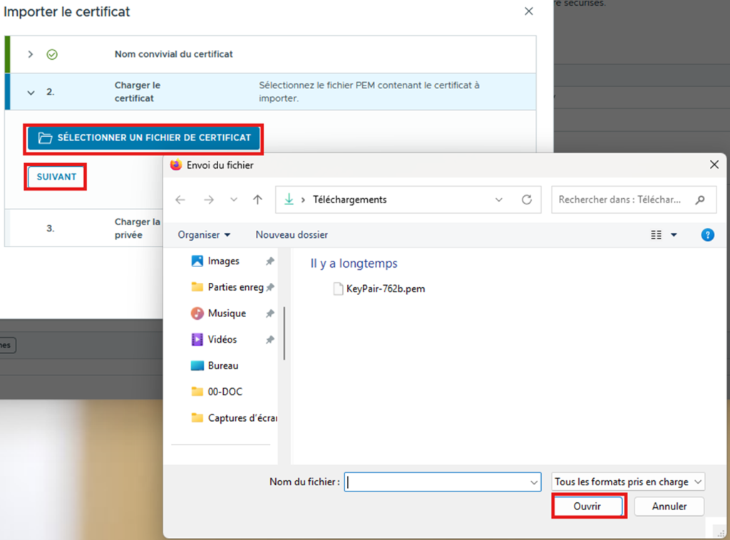 Sélectionner ensuite le certificat en .pem puis le fichier de Clé Privé à Uploader et faire « SUIVANT«