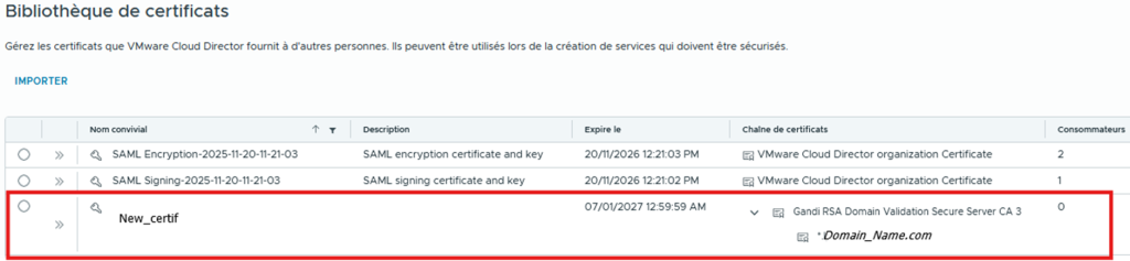 Cliquer sur « IMPORTER » à la dernière étape puis vérifier que le Certificat est bien Uploadé dans la Bibliothèque.