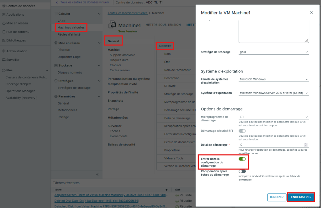 Si vous souhaitez de nouveau accéder au BIOS de la VM, vous devrez recocher le paramètre « Entrer dans la configuration du démarrage » de la VM.