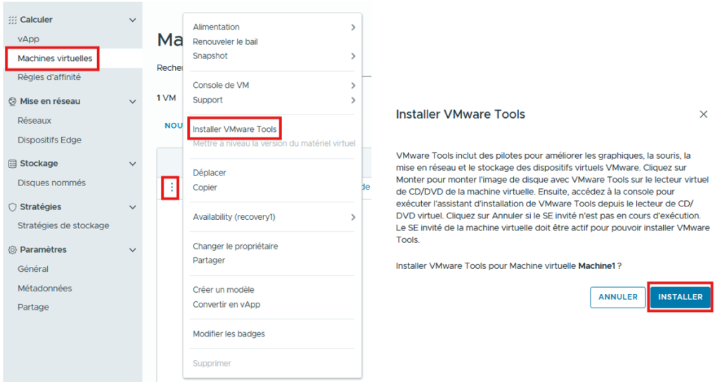 Depuis le menu ACTIONS d’une VM, installer les VMware Tools