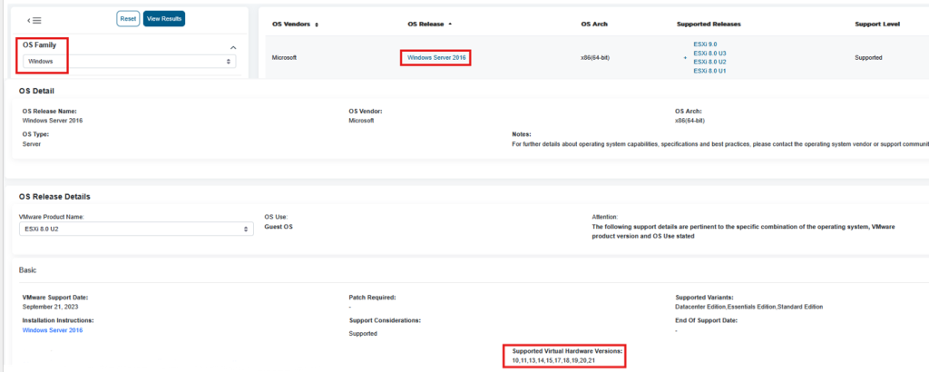 Pour notre exemple, si l’on se réfère à la matrice de compatibilité, Windows Server 2016 est compatible avec la version Hardware 21