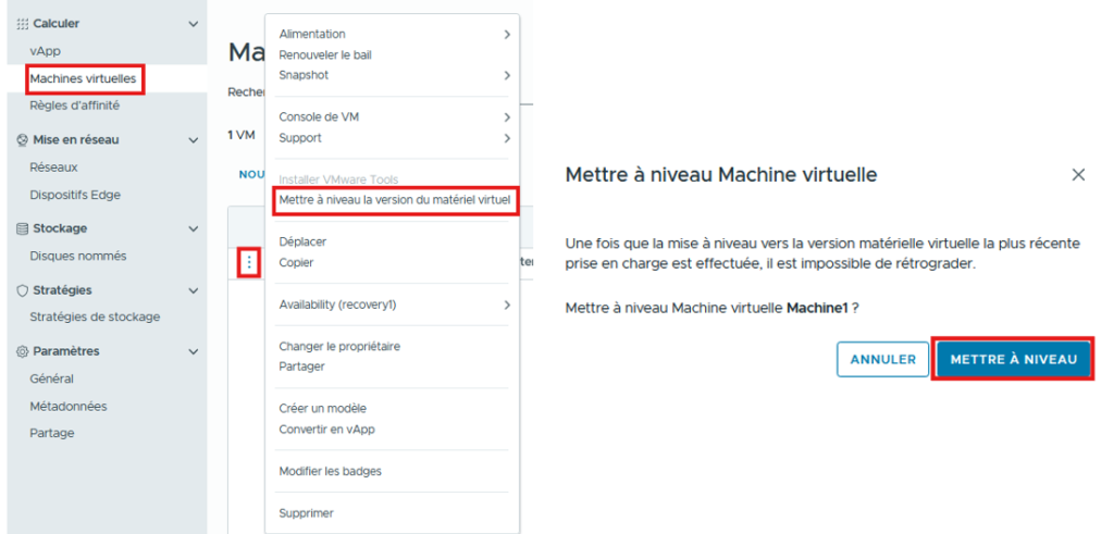 Pour effectuer la mise à jour aller dans le menu ACTIONS de votre VM > Mettre à niveau la version du matériel virtuel puis « METTRE A NIVEAU«