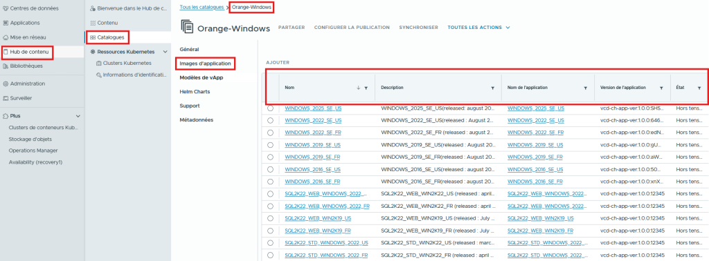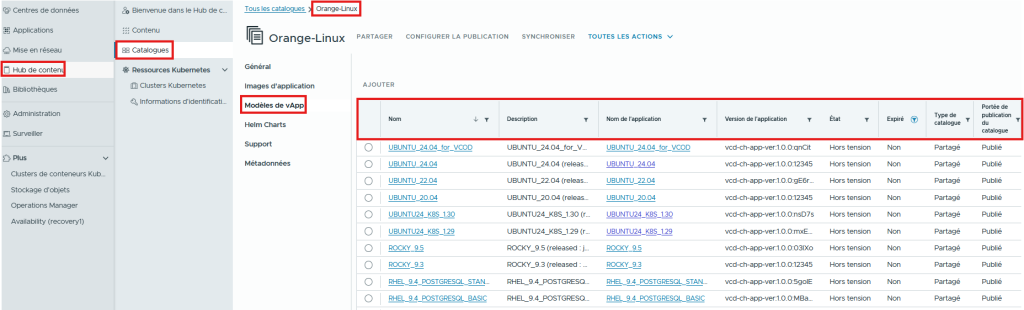 Ces vApps contiennent une VM sur laquelle un OS ou un middleware est déjà installé ou préconfiguré. Pour les Clients Externes, voici les catalogues disponibles depuis l’Espace Hub de contenu / Catalogues