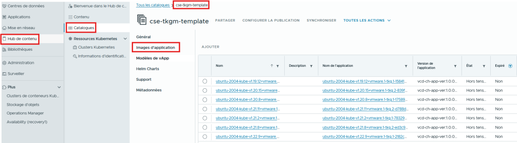- cse-tkgm-template Ce catalogue contient des VM pré-installées avec le logiciel de gestion de conteneurs ; elles sont utilisées pour déployer un cluster Kubernetes.