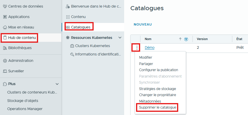 Si vous souhaitez supprimer un Catalogue, vous devez d’abord supprimer les fichiers OVA et ISO qui se trouvent dans le Catalogue.