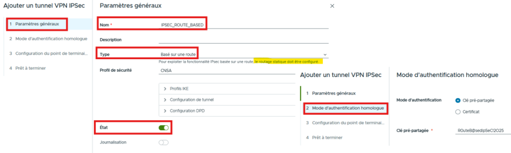 - Basé sur une Route / Route Based : Crée une interface VTI (Virtual Tunnel Interface) pour le VPN, le traffic est acheminé via des tables de routage.