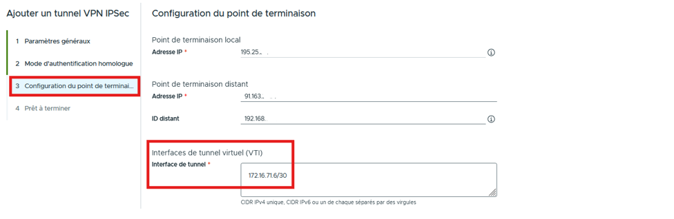 Dans cette partie, on va définir l’IP Publique locale, l’IP Publique distante et l’IP locale de l’interface VTI