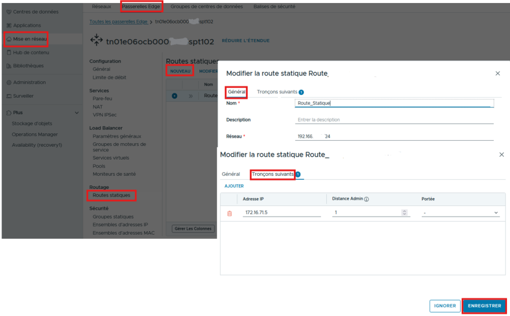 Valider la dernière étape récapitulative puis dans la partie « Passerelle Ege« / »Mise en réseau« / »Routage« / »Routes statiques« , ajouter le Réseau Distant à joindre en indiquant comme Prochain Saut l’IP du VTI puis « ENREGISTRER«