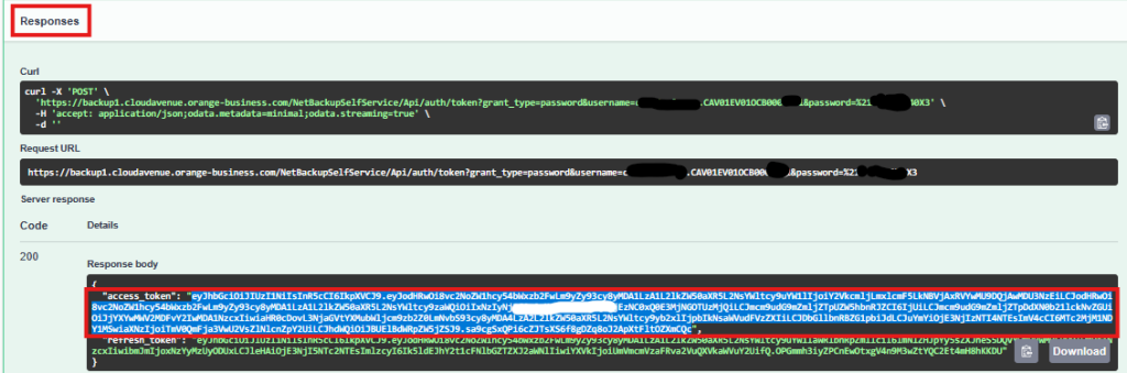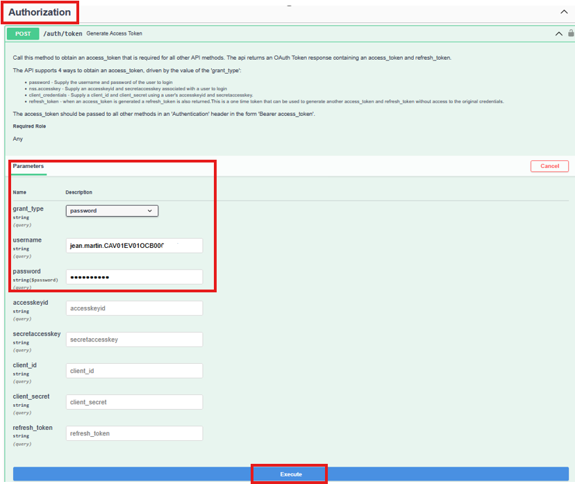 Depuis la Vue Authorization cliquer sur le bouton Try it out et renseigner les champs suivants :