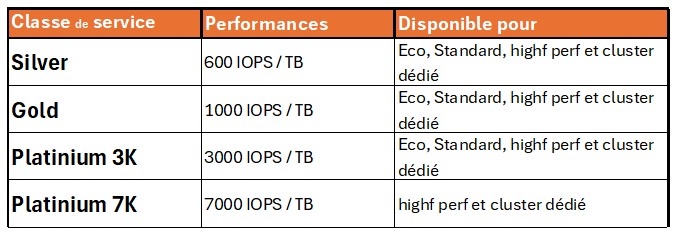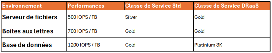 Le nombre d’IoPS et la classe de service qui sont recommandé pour chaque environnement :
