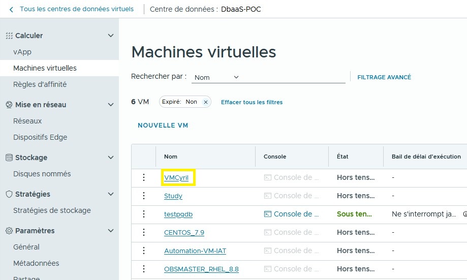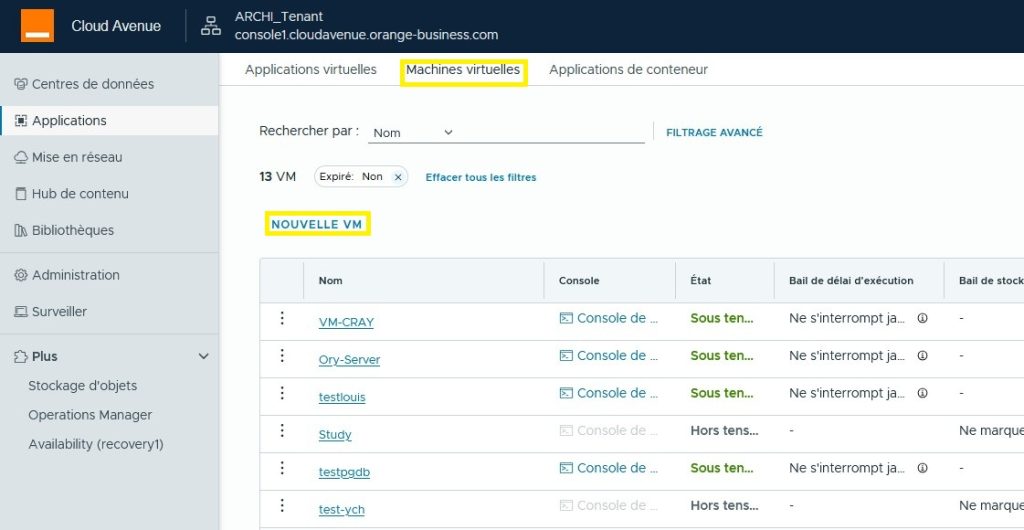 Sur le portail VCD, connectez-vous à votre organisation et accédez à votre OrgvDC. Ensuite, accédez à votre centre de données et sélectionnez Machine virtuelle. Cliquez sur Nouvelle VM.
