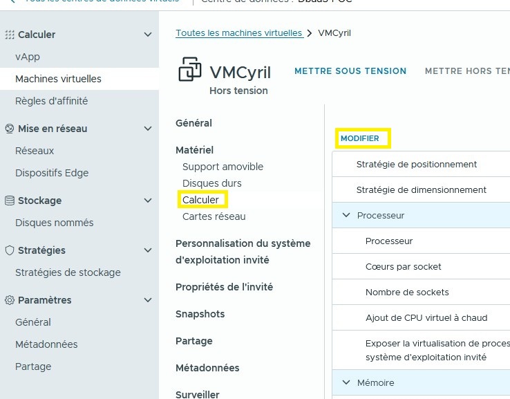 Une fois la machine virtuelle créée, vous pouvez la modifier en tout instant à condition que la celle-ci soit arrêter, l’opération ne peut pas se faire à chaud.
