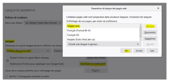 Par défaut, la langue de l’interface de vCloud Director est la langue déclarée par le navigateur utilisé. Vous pouvez à tout moment modifier ces paramètres depuis les options de celui-ci :