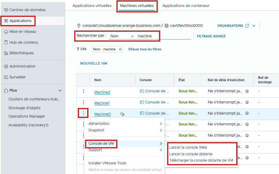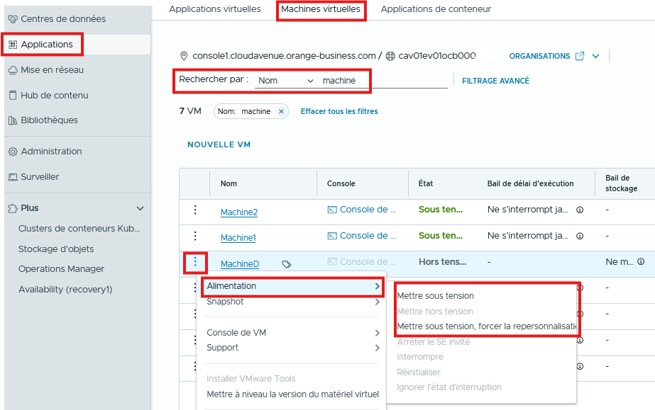 Depuis le menu Applications / Machines virtuelles / ACTIONS > Alimentation