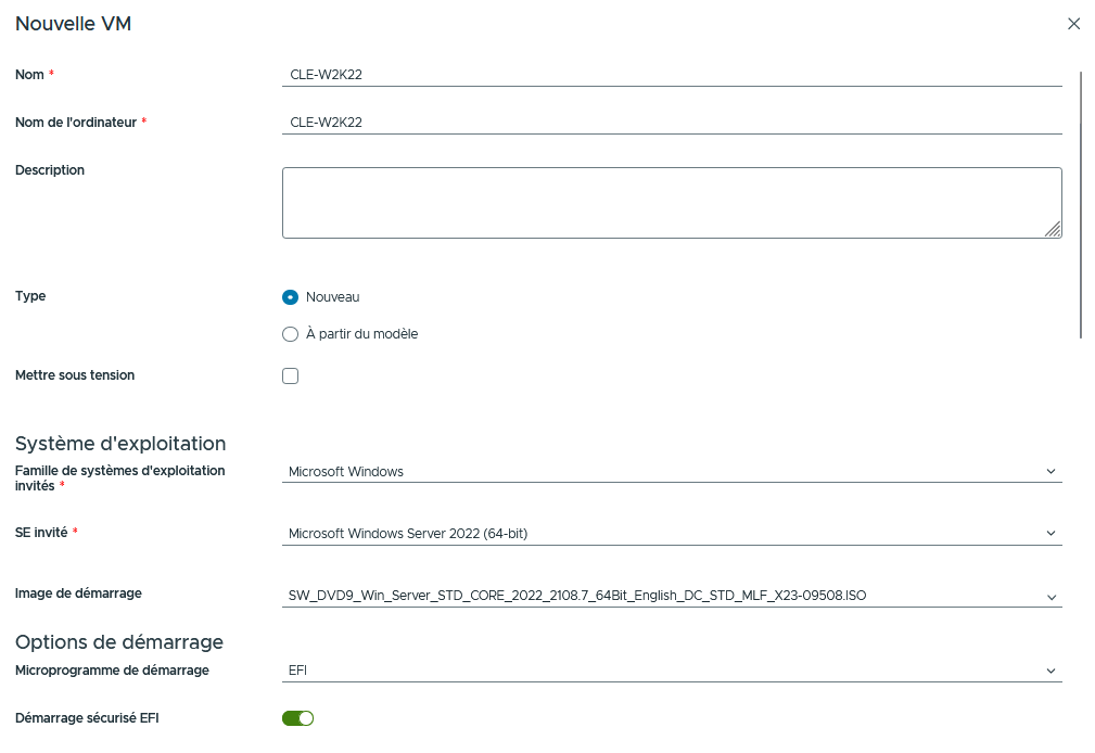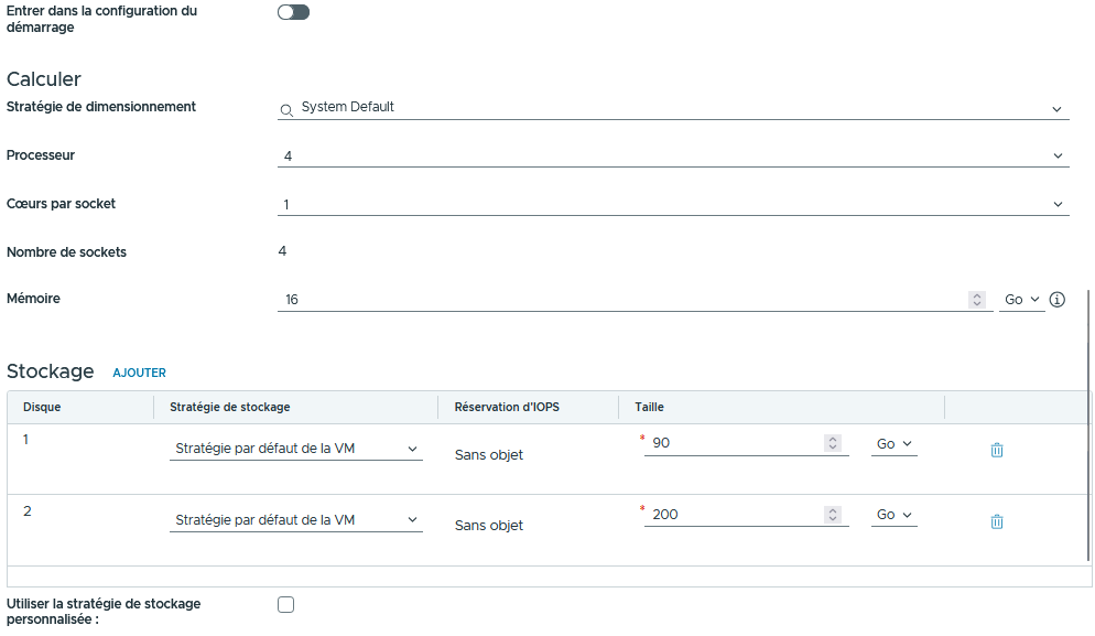 - Choisir le Nom de la VM, les Ressources CPU, Mémoire, Stockage souhaitées et faire OK