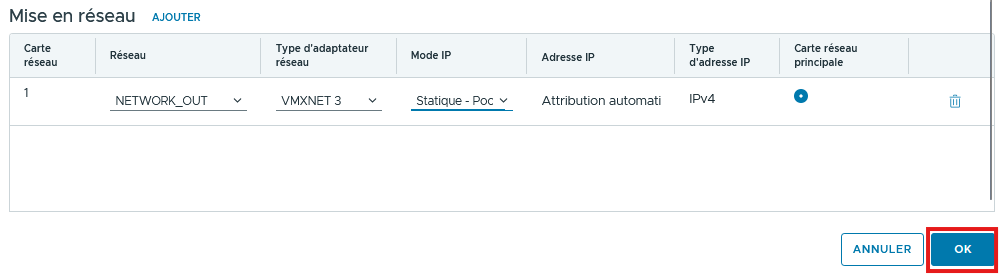 - Ajouter ensuite le réseau à la VM et démarrer la VM en cliquant sur METTRE SOUS TENSION