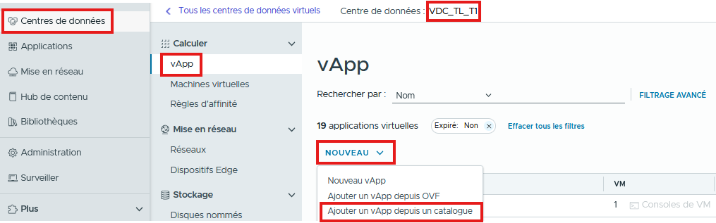 - Rendez-vous dans Centres de données > vApp > NOUVEAU > Ajouter un vApp depuis un catalogue