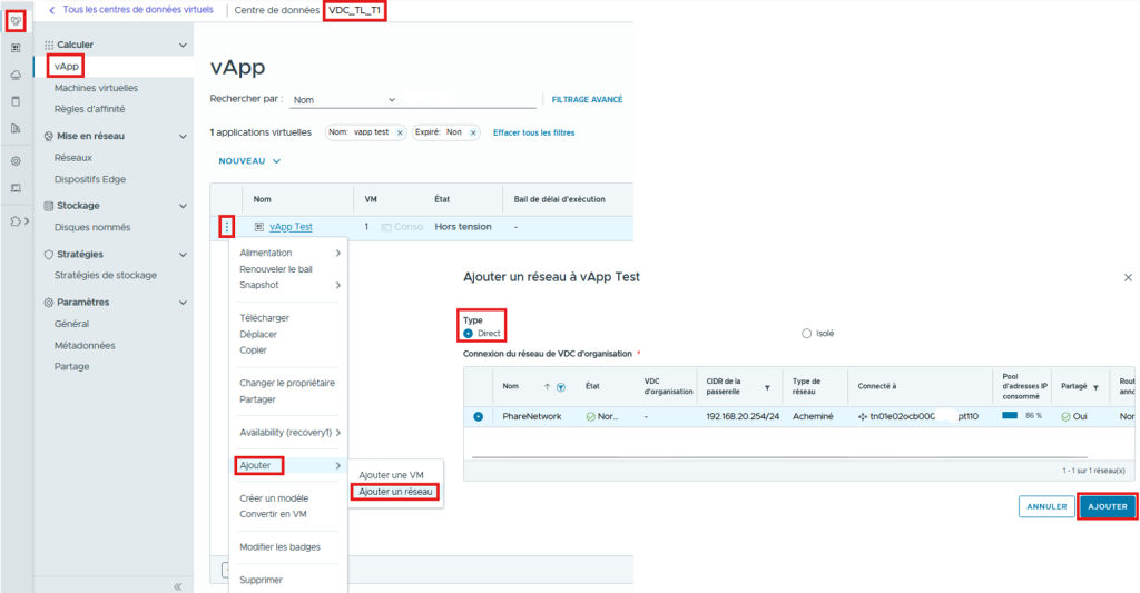 - Depuis Centre de données / vApp / Ajouter / Ajouter un réseau
