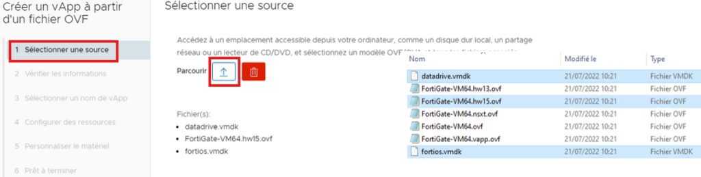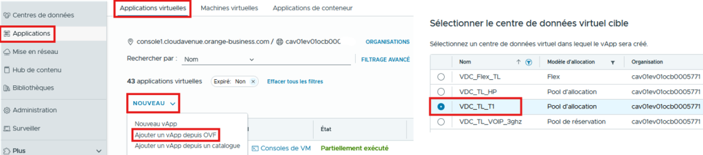 - Depuis la partie Application / Applications virtuelles / NOUVEAU / Ajouter un vApp depuis OVF puis sélectionner le VDC associé