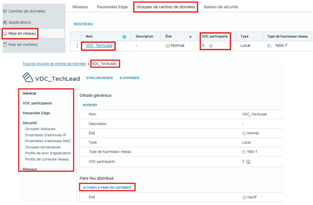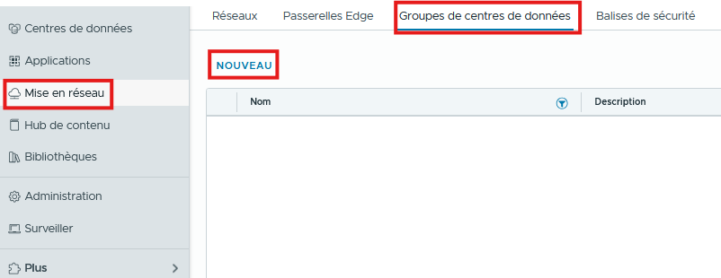 La gestion des groupes de VDC se fait depuis l’onglet Mise en réseaux > Groupe de centre de données.