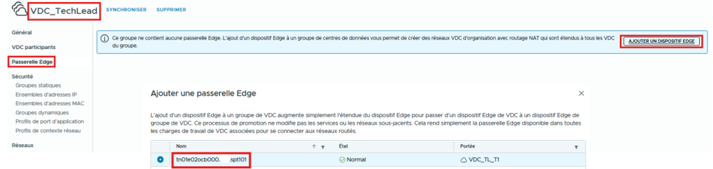 - Depuis l’onglet Passerelle Edge vous devez ajouter une Edge T1 pour pouvoir partager les réseaux entre vDC.