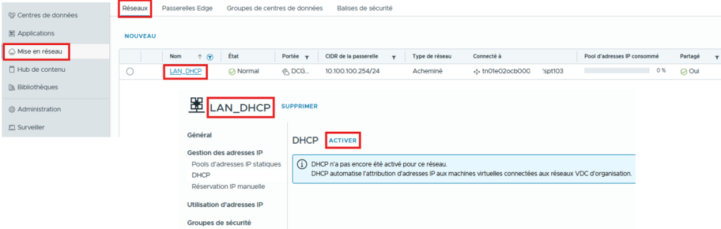 Le DHCP permet l’attribution automatique d’IP à des VMs situées derrière la Edge. Plus de Détails ICI