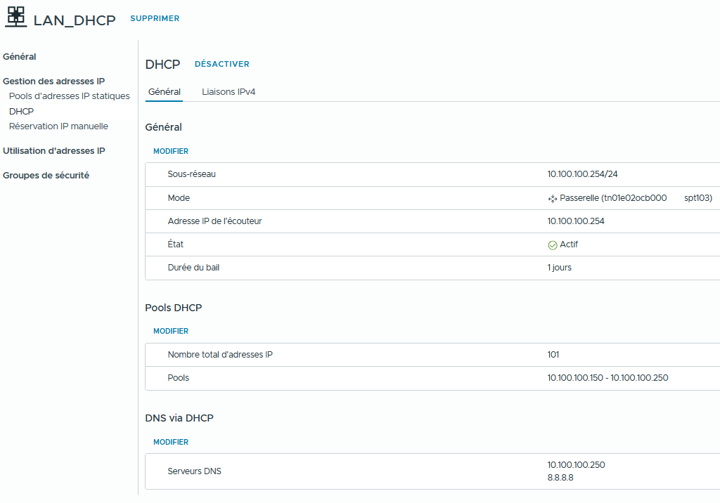 Une fois terminé, vous retrouvez les détails de votre service DHCP.
