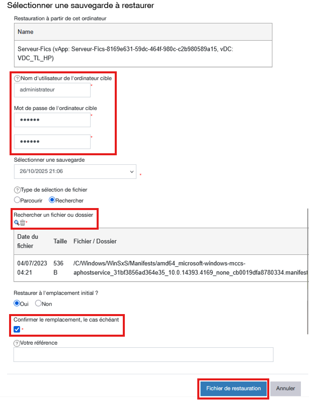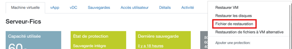 Sélectionner la VM et cliquer sur le bouton Action puis choisir Fichier de restauration.