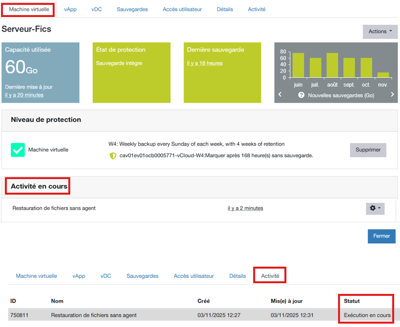 Vous pouvez suivre l’avancement dans la vue Machine virtuelle / Activité en cours ou depuis l’onglet Activité